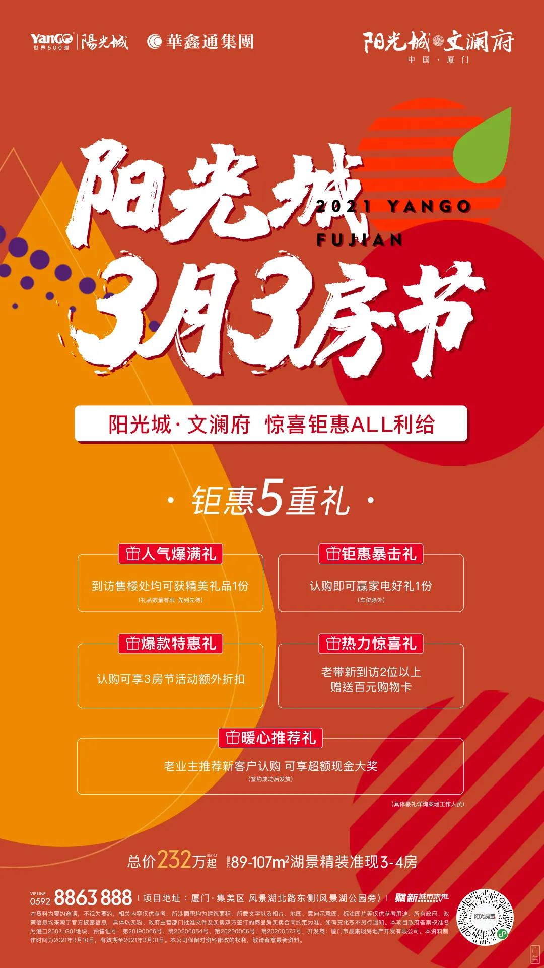 人生有别,一宅见高下。阳光城文澜府基址集美城芯,以匠心筑不凡,礼献全城高阶人士。恰逢阳光城3月3房节,认购即享钜惠5重礼!文澜府18#火爆热销中,预购从速!