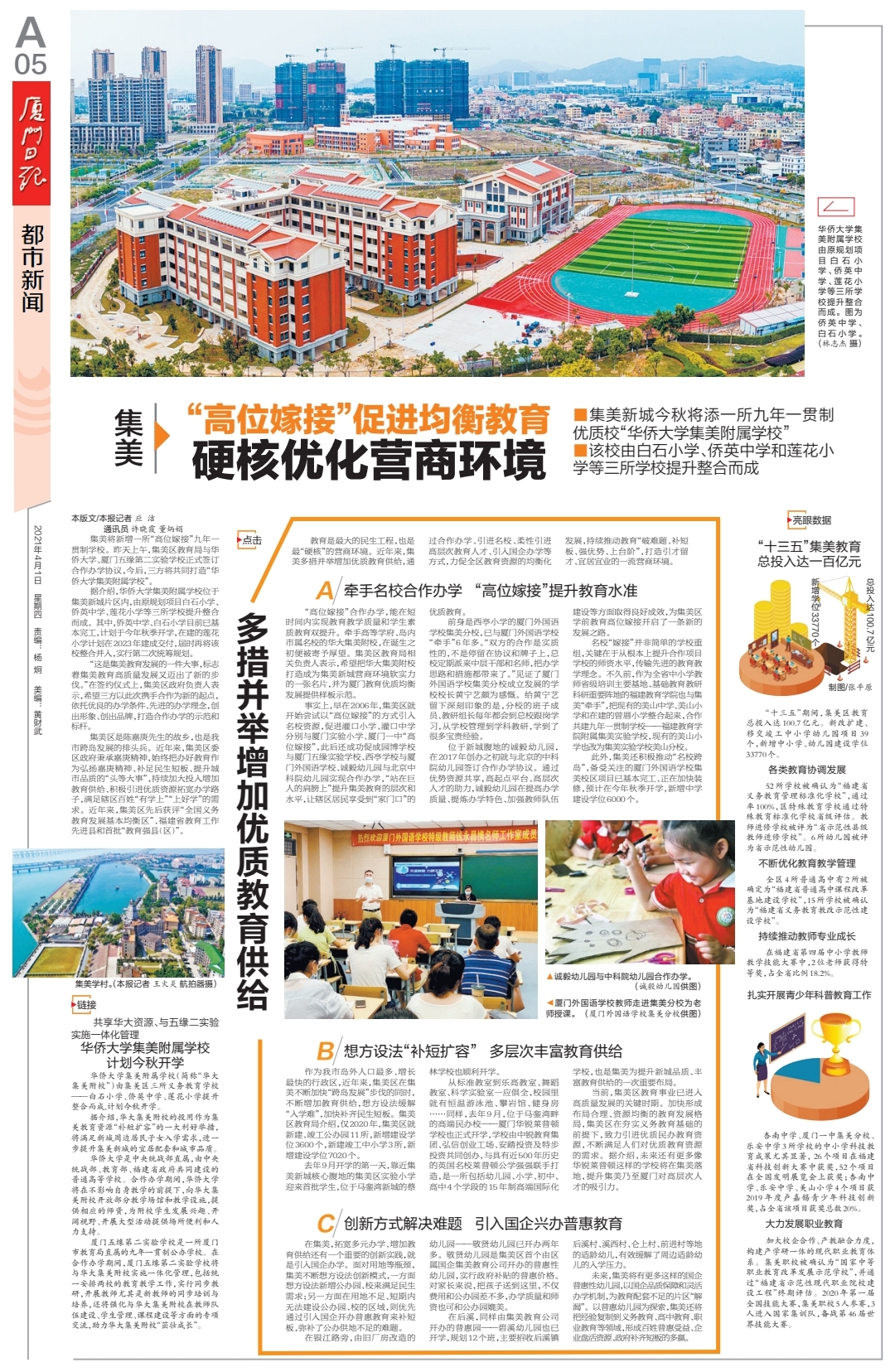 近期,集美区教育局、华侨大学校方、厦门五缘第二学校校方在众多媒体的关注下,联合举行了隆重的合作办学签约仪式。三方约定,将集美新城白石小学、侨英中学整合为九年一贯制学校——华侨大学集美附属学校(加挂“厦门五缘第二实验学校集美分校”),且将于2021年秋季学期开办。集美区教育局相关负责人表示,希望将华大集美附校打造成为集美新城营商环境软实力的一张名片,并为厦门教育优质均衡发展提供样板示范!此举意味着集美又一名校诞生,集美教育迈上一个新的台阶!