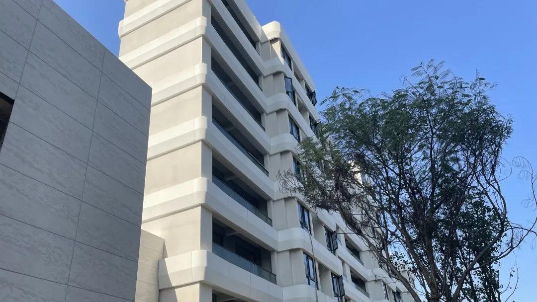 6#楼(6层)室内刮腻子完成,外墙涂料施工完成95%,幕墙铝板安装完成,室内地面施工完成。