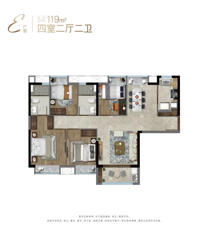 建面约119㎡奢阔4房,超大面宽尺度,满足三代和睦同堂。也可按需规划空间功能,包容全龄形态。全家人既可享欢聚时刻,亦拥有各自私密空间。套房式主卧,私享衣帽间、独立卫浴,揽景飘窗,让“宅家”生活也备受宠爱,悠然自得。