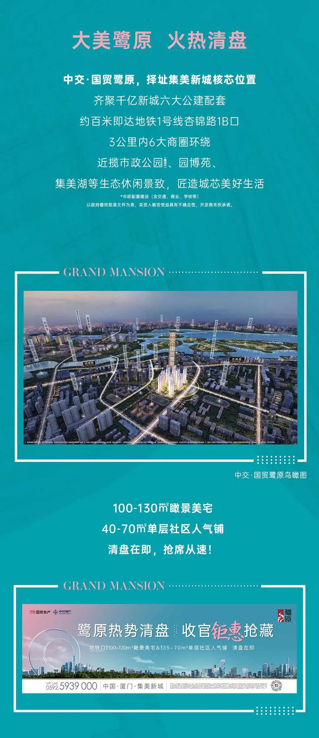 1、本项目推广名为“中交·国贸鹭原”,开发公司:“厦门润悦雅颂房地产有限公司”。2、部分图片来自网络,如有侵权请联系删除。3、本宣传资料文字、数据和图片仅供参考,不作为要约或承诺,相关宣传内容不排除因政府相关规划、规定及出卖人分期规划、未能控制等原因而发生变化。买卖双方的权利义务以双方签订的《商品房买卖合同》及其补充协议、附件等书面文件为准。4、项目西侧距杏苑小学约10米,具体招生划片方案以政府每年发布的招生工作意见为准,项目周边相关学校招生计划由政府教育主管部门制定,本资料所列项目周边教育资源介绍不作为开发商对业主的就学承诺。项目附近学校、幼儿园的招生条件、学校名称、办学性质、办学规模、开学时间、收费标准及招生区域等均须以政府教育主管部门政策及学校、幼儿园的相关文件为准,出卖人对此并不提供任何保证和承诺。5、本宣传资料本资料所提及6大商业,分别指集美世茂广场、ioi mall(在建)、龙湖商业综合体(在建)、杏锦路站综合体(在建)、大悦城(在建)、万科云城,对商业的具体业态、开业时间等仅作介绍,不代表出卖人对此作出要约或承诺,具体以经营者实际经营为准;交通配套信息来源于2020年5月13日厦门地铁官网数据,市政配套信息来源于2020年9月25日厦门市自然资源和规划局数据,仅供参考。出卖人对项目周边市政配套建设(含交通、商业、学校等)、项目规划的描述、说辞仅为出卖人对所了解信息的介绍,不代表着出卖人对此作出要约或承诺,所有规划与配套设施以政府最终批准文件为准。6、本资料制作时间为2022年2月,有效期7天,敬请留意最新资料。一批次预售证号:20200077、二批次预售证号:20210015。