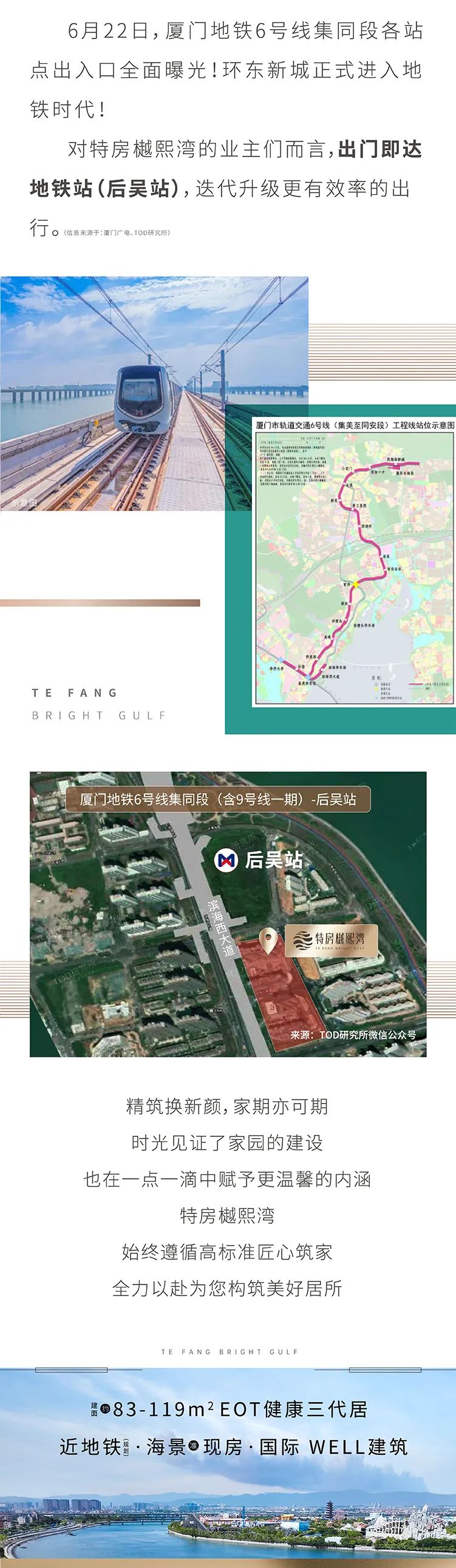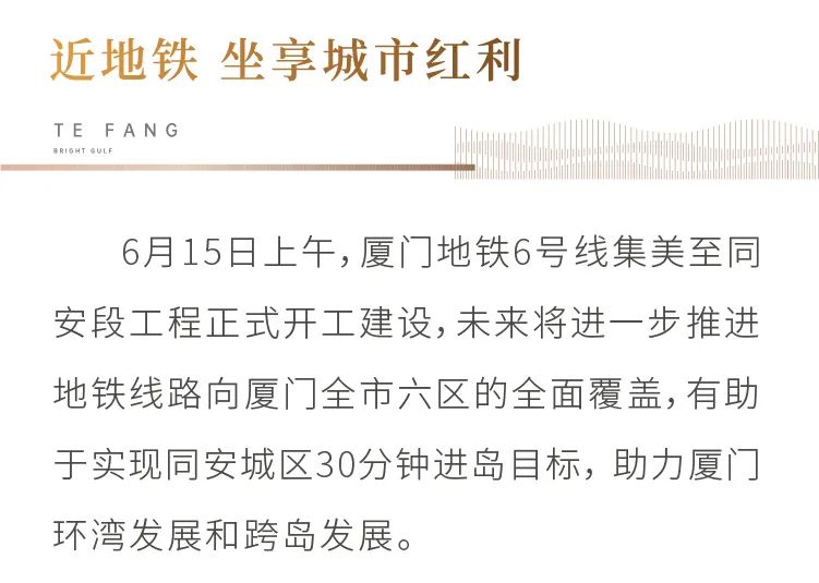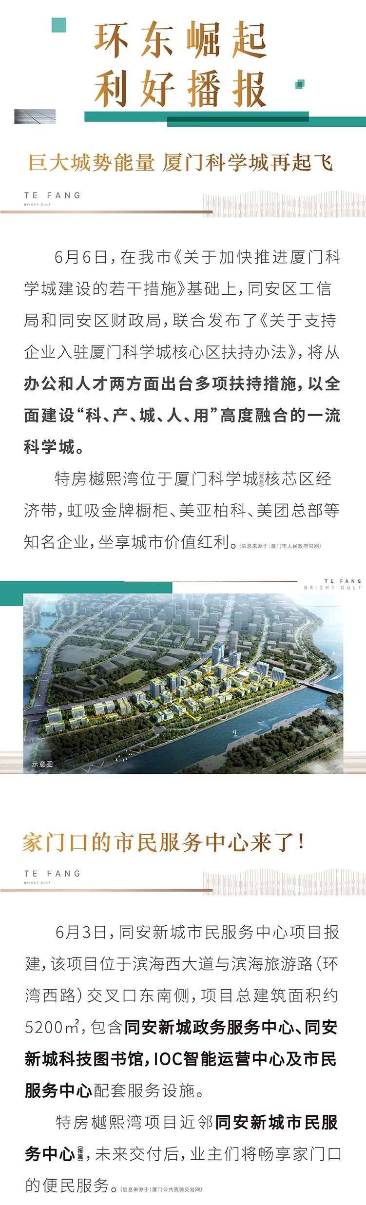 免责声明:1、本项目推广名为”特房樾熙湾”;开发商:厦门特房嘉湾房地产有限公司;2、本资料为要约邀请,不作为要约或承诺; 3、部分图片、文字等内容源自网络,版权归原作者所有,本文只作为引用,如原作者表明身份要求本公司停止使用该素材,请及时与本公司联系删除; 4、相关宣传内容不排除因政府相关规划、规定及出卖人分期规划、未能控制等原因而发生变化; 5、本资料所发布的时间为2022年7月,出卖人可能会不定期对宣传资料进行修改,敬请留意最新资料;6、本资料提及以上学校仅为客观阐述项目周边教育配套,未来项目就读的幼儿园、小学、中学等教育资源,以教育局当年的招生政策以及各校的招生简章为准,本司不做任何就读承诺。7.文中提及:交通规划、“环东之眼”公建群(在建)、滨海旅游浪漫线、下潭尾滨海湿地公园、同安一中滨海校区、环东海域医院(在建)、爱琴海购物公园&红星·欧丽洛雅(在建)信息来源于厦门日报、厦门市市政园林局、同安一中滨海校区官网。8、本资料文字、数据和图片仅供参考,不作为要约或承诺。部分房屋因楼栋及朝向关系无法瞰景,具体景观面以现场实际楼栋位置及户型分布为准。相关宣传内容不排除因政府相关规划、规定及出卖人分期规划、未能控制等原因而发生变化。9、本宣传资料所涉及的户型仅供示意参考,其装修、家具、陈设等非交付标准,不属于交付范围。不同户型的面积尺寸,功能布局,空间分割、门窗/管井形态位置等均有不同;相同户型因楼栋、楼层、单元等差别,局部结构、面积等也可能不同,具体以政府部门最终审定的图纸和销售合同的约定为准。买卖双方的权利义务以双方签订的《商品房买卖合同》及其补充协议、附件等书面文件为准。