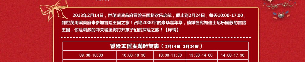 2013年2月14日—24日,世茂湖滨首府重磅推出2013年儿童成长计划第一季——“冒险王国新春童乐会”,届时,全城亲子家庭将齐聚世茂湖滨首府,共享欢乐新春!