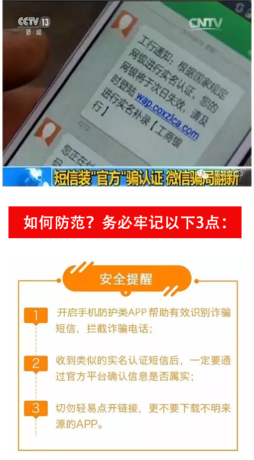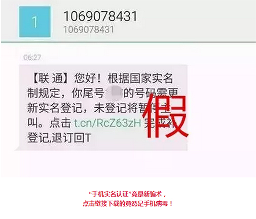 最近,一条利用“手机号码实名认证”的诈骗短信惊现江湖,短信内容是这样的:“您好!根据国家实名制规定,你尾号261的号码需要更新实名登记,未登记将暂停主叫。点击t.cn/Rc***kV完成补登记,退订回T”。